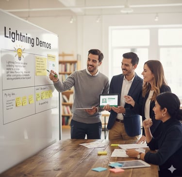 The real power of a Lightning Demo is not the individual research. It is what happens when the team comes together. Each person goes out into the world, collects inspiration from different industries and perspectives, and brings those insights back into the room. When these ideas are shared openly, the team builds a shared understanding of what is possible. When the group selects the most promising ideas as a collective, motivation rises because the direction feels co-created rather than imposed. Innovation does not come from one person having a breakthrough. It comes from many people contributing diverse ideas and then shaping them into a single, unified solution. This collaborative process strengthens ownership, accelerates decision-making and helps teams feel more energised about the path ahead.